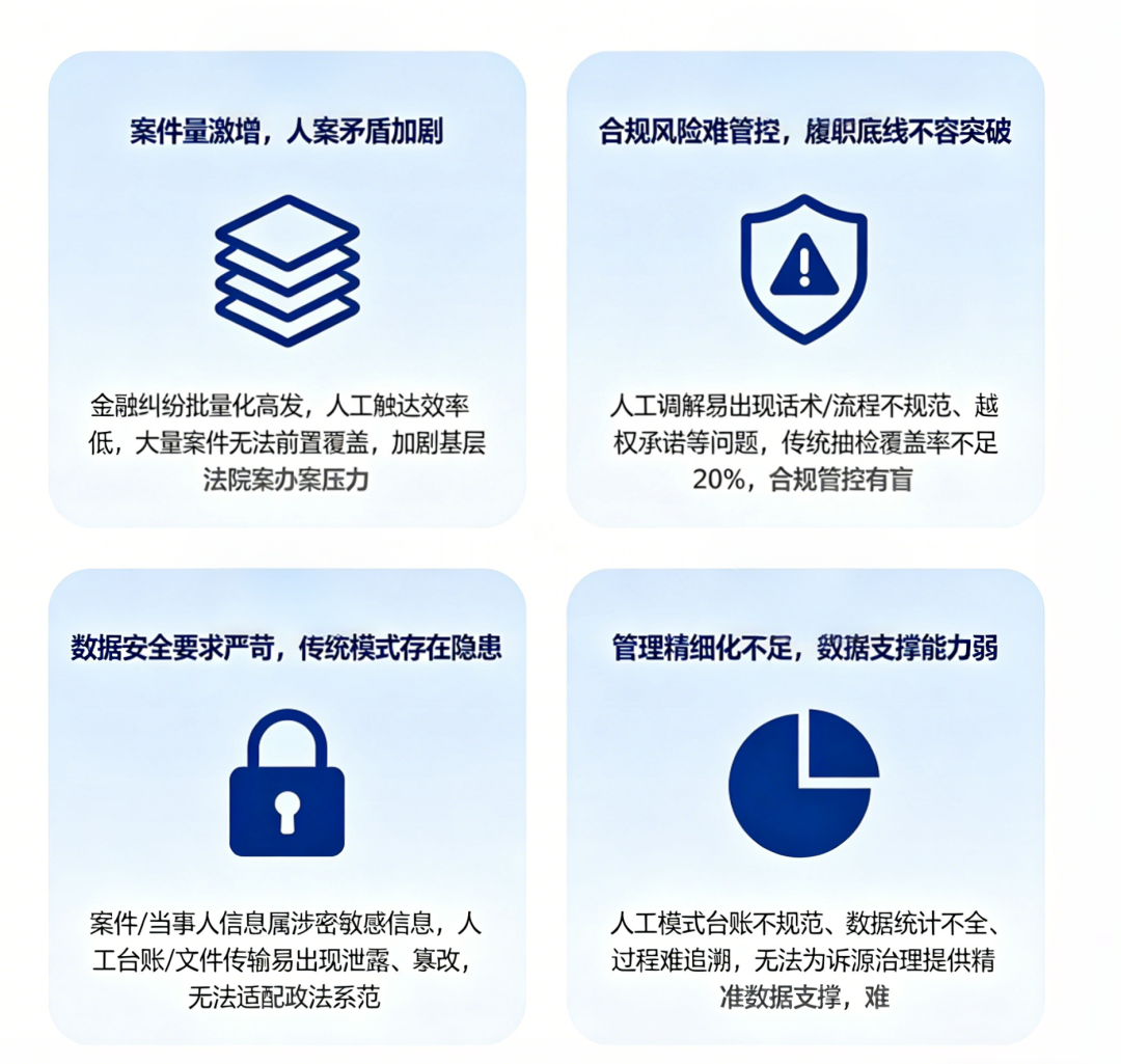 合规风险难控:人工调解话术/流程不统一,违规风险高,人工抽检覆盖率不足20%,易引发问责;