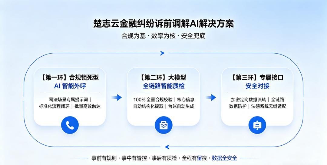 楚志云科技针对基层法院金融纠纷(借款合同、信用卡逾期)案件高位运行的核心痛点,打造“合规锁死型AI智能外呼+大模型全链路智能质检+专属接口安全对接”全链