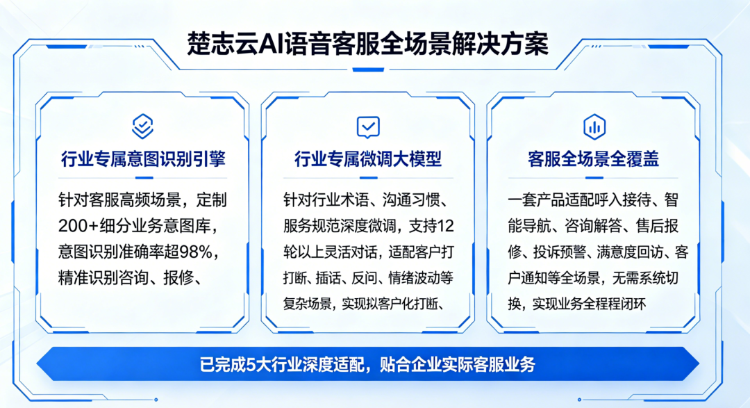 楚志云 AI 语音客服,聚焦客服全场景深度打磨,针对不同行业打造专属定制化 AI 引擎,已完成 5 大行业深度适配,真正贴合企业实际业务: